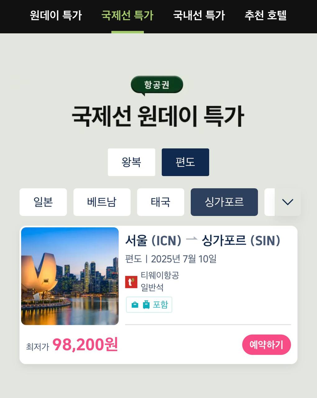 팁: 지역을 ‘서울 → 싱가포르’로 고정해 놓고, 달력 보기에서 최저가 날짜를 한눈에 파악해 보세요. 의외의 평일 새벽 출발 편이 10만 원 미만인 경우도 많습니다.